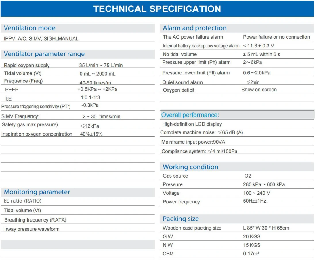 High-definition LCD display Complete machine noise: <65 dB (A). Mainframe input power:90VA Compliance system:<4ml/100Pa