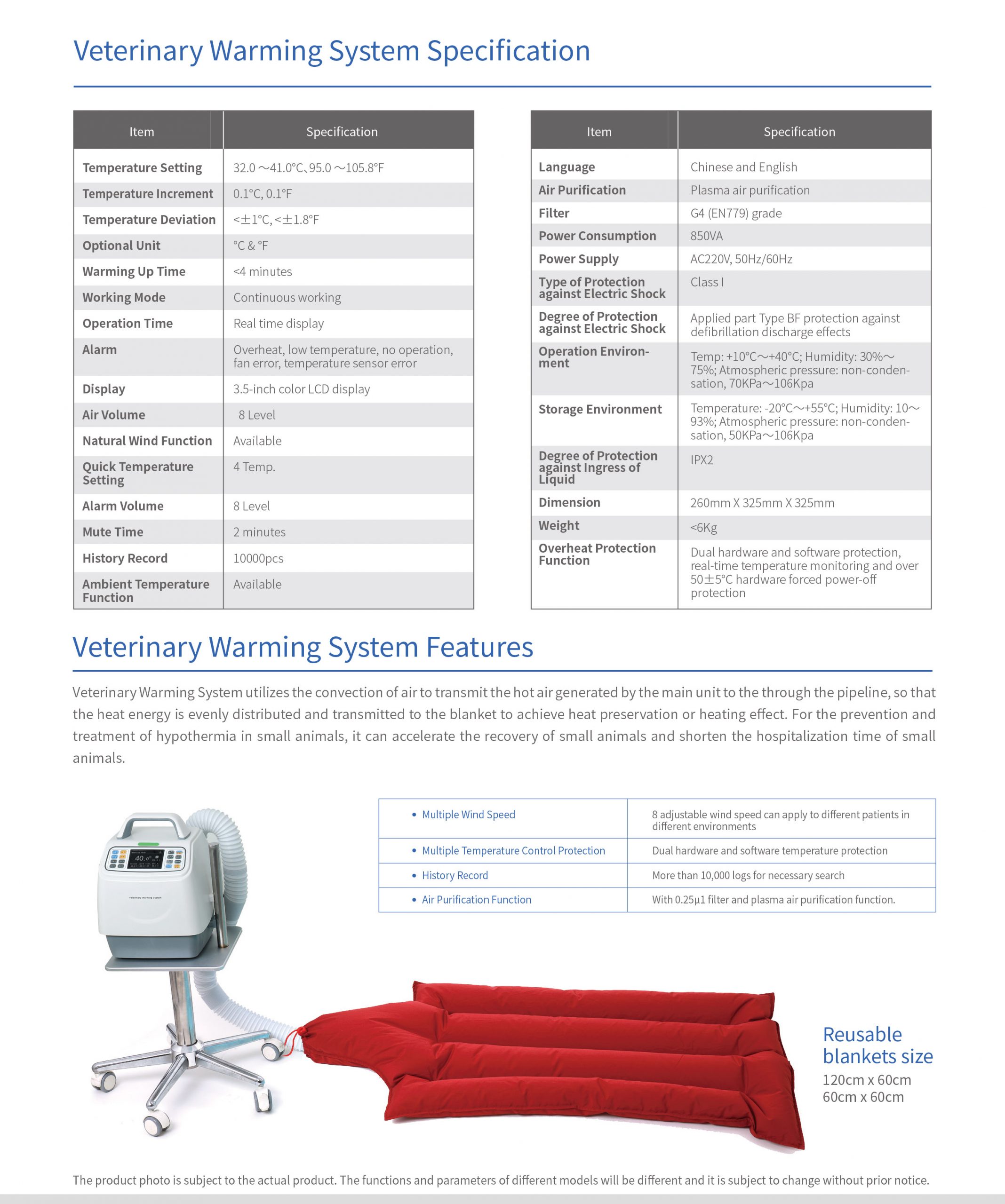 Veterinary Warming System utilizes the convection of air to transmit the hotair generated by the main unit to the through the pipeline, so thatthe heat energy is evenly distributed and transmitted to the blanket to achieve heat preservation or heating effect. or the prevention andtreatment of hypothermia in small animals , it can accelerate the recovery of small animals and shorten the hospitalization time of smalanimals.